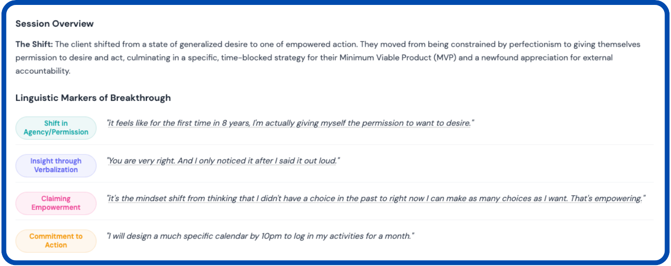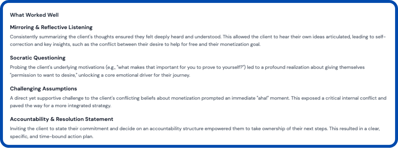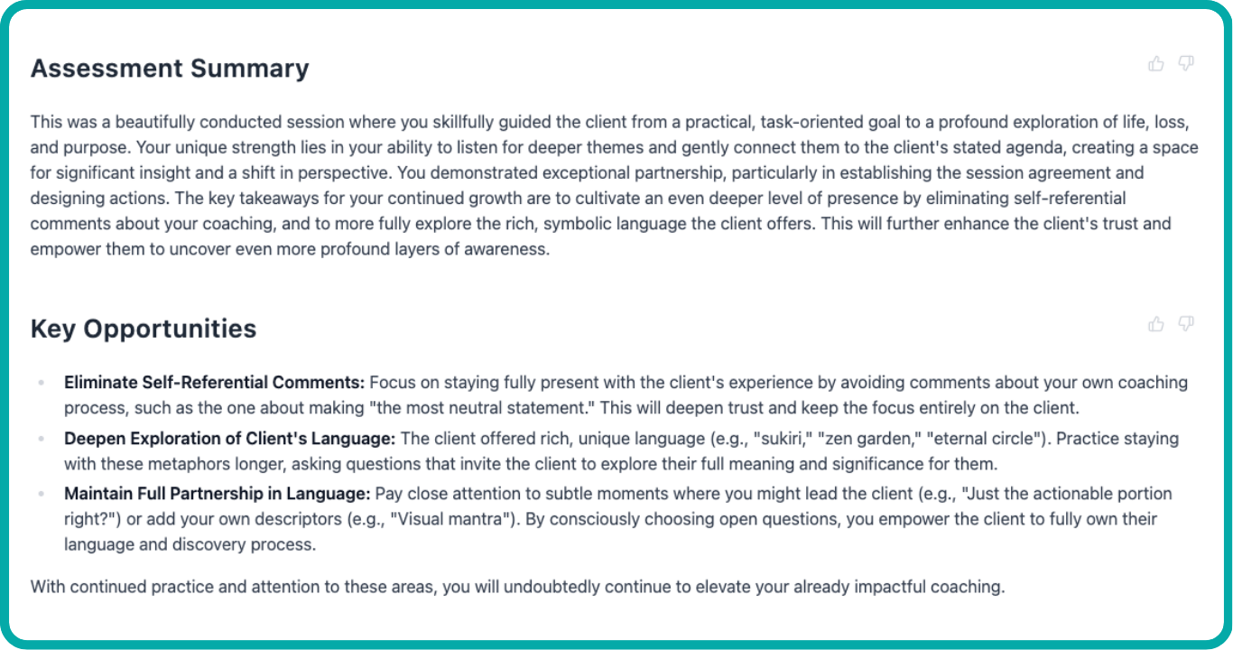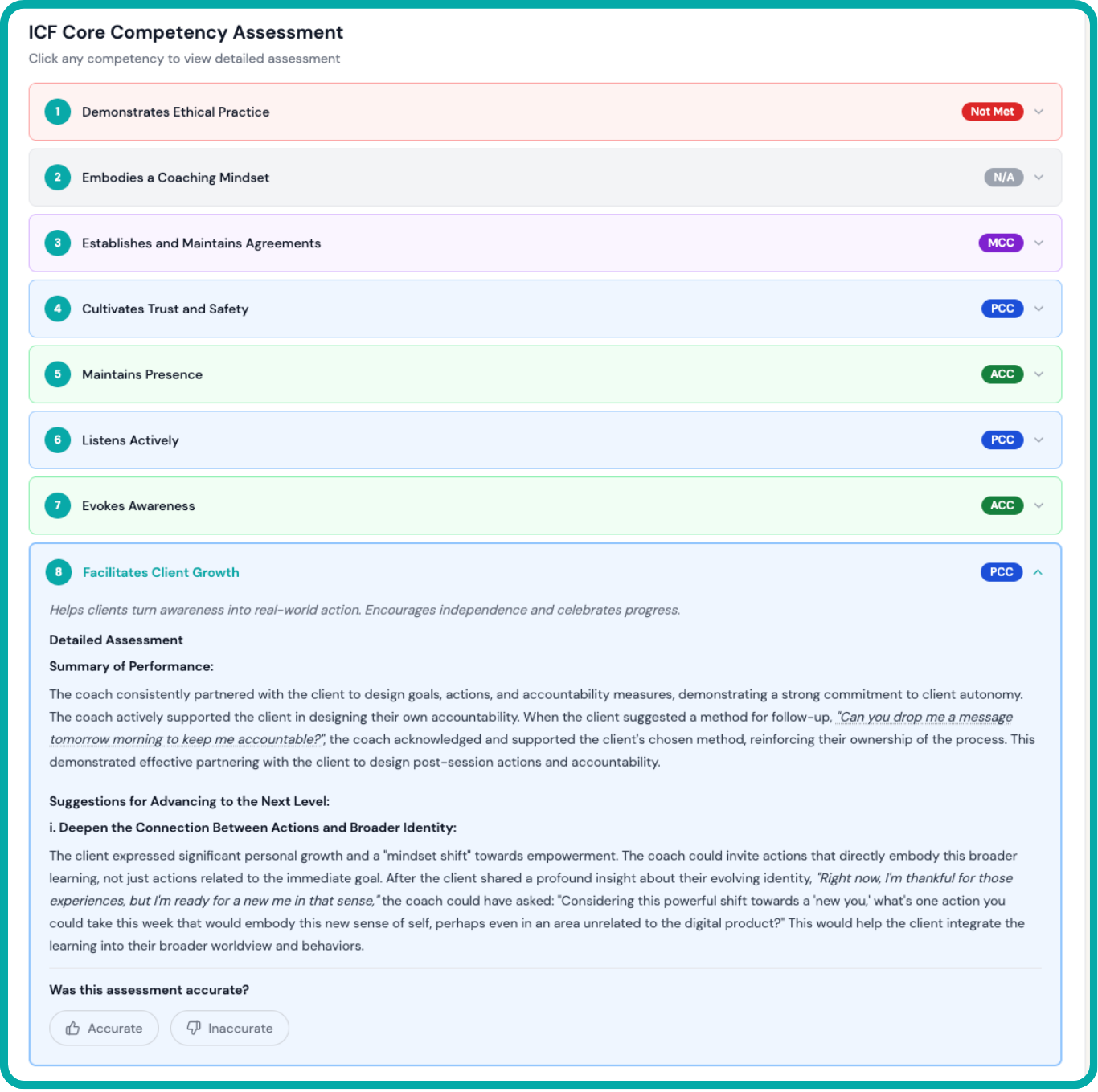 CoachBetter uses Large Language Models to analyze coaching transcripts and identify markers that align with ICF competencies at different certification levels. By examining coaching conversations, the platform evaluates various coaching competencies and provides detailed feedback.